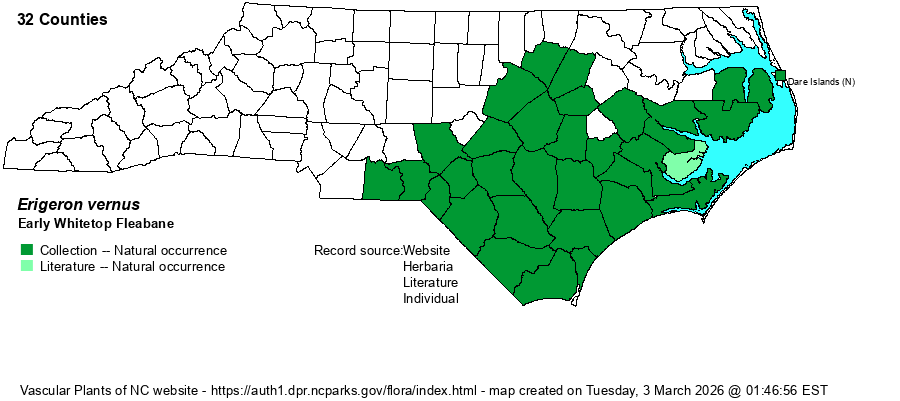 | Identification | Early Whitetop Fleabane grows from a rosette of thick-textured, dark green, elliptic to obovate basal leaves. Stems grow mostly 8 inches to 1.5 feet tall, and stem leaves are few and very small, giving the plant a "naked stem" look. Heads are rather large for a fleabane, with numerous long and broad white rays and dull yellow disks. Small rosettes can look somewhat like those of Venus Flytrap (Dionaea muscipula) at first glance, especially as this fleabane is often quite common in pine savannas where the much scarcer flytraps grow. | |