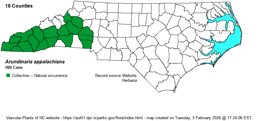 | Habitat | This semi-woody grass is found essentially only on dry to mesic slopes of hardwood or mixed forests. It occurs in sizable stands (as do other members of the genus). It is not generally found in wetlands such as bottomlands and along creeks where other Arundinaria species are found. Its common name reflects this habitat. | |