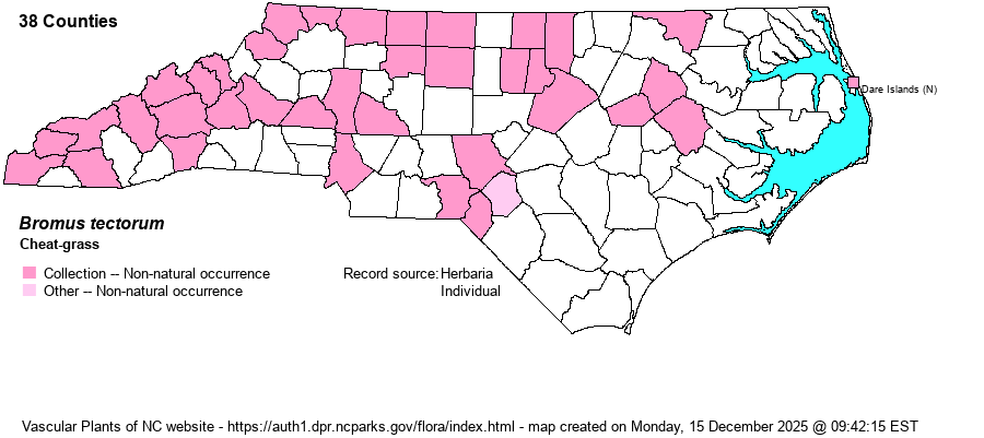 | Identification | Cheat-grass is closely similar to B. sterilis, and both have drooping spikelets when mature. However, Cheat-grass has shorter awns and glumes -- see Weakley (2018) for measurements. | |