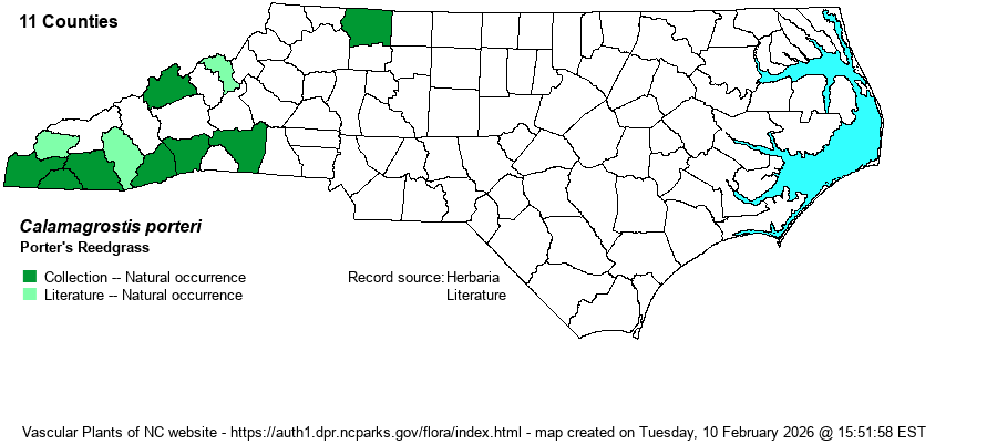 | Identification | Cain's Reedgrass (C. cainii) and Porter's Reedgrass are best told from Bluejoint Reedgrass (C. canadensis) by having awns surpassing the lemmas (vs. shorter than the lemmas in C. canadensis). From Cain's Reedgrass, Porter's is readily told by its wider leaves (3-8 mm wide vs. 2-3 mm wide in the latter species) and a denser inflorescence. | |