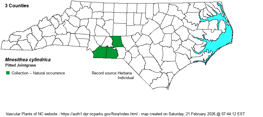 | Mnesithea cylindrica | = | Coelorachis cylindrica | Gleason and Cronquist (1991) | | | Mnesithea cylindrica | = | Coelorachis cylindrica | Flora of North America (1993b, 1997, 2000, 2002a, 2002b, 2003a, 2004b, 2005, 2006a, 2006b, 2006c, 2007a, 2009, 2010) | | | Mnesithea cylindrica | = | Coelorachis cylindrica | Kartesz (1999) | | | Mnesithea cylindrica | = | Coelorachis cylindrica | Wunderlin & Hansen Flora of Florida (3) | | | Mnesithea cylindrica | = | Manisuris cylindrica | Fernald (1950) | | | Mnesithea cylindrica | = | Manisuris cylindrica | Gleason (1952) | | | Mnesithea cylindrica | = | Manisuris cylindrica | Godfrey and Wooten (1979, 1981) | | | Mnesithea cylindrica | = | Manisuris cylindrica | Hitchcock & Chase (Manual of US Grasses) | | | Mnesithea cylindrica | = | Manisuris cylindrica | Radford, Ahles, and Bell (1968) | | | Mnesithea cylindrica | = | Manisuris campestris | Small (1933, 1938) | | | Source: Weakley's Flora |