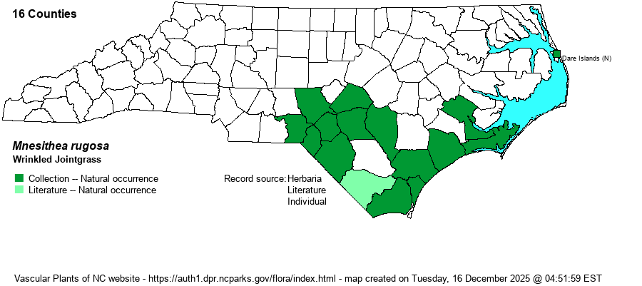 | Mnesithea rugosa | = | Coelorachis rugosa | Gleason and Cronquist (1991) | | | Mnesithea rugosa | = | Coelorachis rugosa | Flora of North America (1993b, 1997, 2000, 2002a, 2002b, 2003a, 2004b, 2005, 2006a, 2006b, 2006c, 2007a, 2009, 2010) | | | Mnesithea rugosa | = | Coelorachis rugosa | Kartesz (1999) | | | Mnesithea rugosa | = | Coelorachis rugosa | Flora of Virginia | | | Mnesithea rugosa | = | Coelorachis rugosa | Wunderlin & Hansen Flora of Florida (3) | | | Mnesithea rugosa | = | Manisuris rugosa | Fernald (1950) | | | Mnesithea rugosa | = | Manisuris rugosa | Gleason (1952) | | | Mnesithea rugosa | = | Manisuris rugosa | Godfrey and Wooten (1979, 1981) | | | Mnesithea rugosa | = | Manisuris rugosa | Hitchcock & Chase (Manual of US Grasses) | | | Mnesithea rugosa | = | Manisuris rugosa | Radford, Ahles, and Bell (1968) | | | Mnesithea rugosa | = | Manisuris rugosa | Small (1933, 1938) | | | Source: Weakley's Flora |