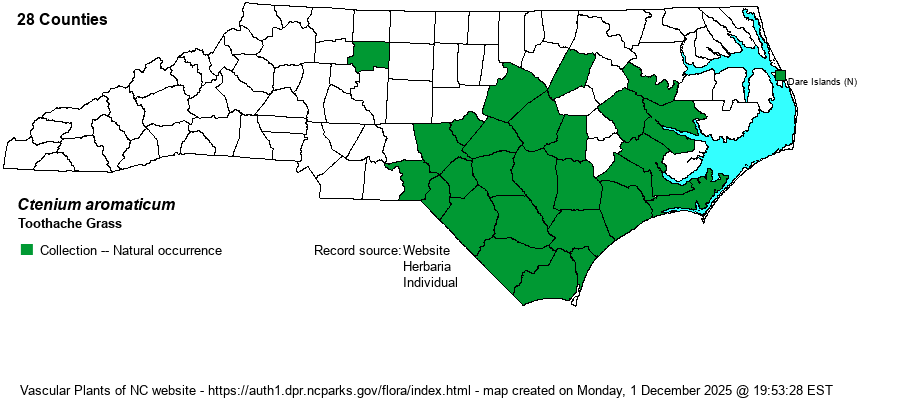 | Distribution | Coastal Plain and Sandhills. Disjunct to Roanoke Island (Dare County). Seemingly absent in the northern quarter of the Coastal Plain, though it does occur in southeastern VA. The disjunct record for Forsyth County is correctly identified and reads "meadow, Salem Creek, N.C., W.-S.", 23 July 1911, P. Schallert s.n. (DUKE). However, it is very likely a mis-labeling of a plant collected elsewhere.