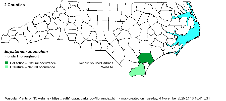 | Distribution | Identification of NC specimens is highly uncertain, owing to being recently split out from E. recurvans; they were collected in Bladen, Brunswick, Carteret, Columbus, Dare, Duplin, New Hanover, Pamlico, and Pender counties.  If specimens are correctly identified, it occurs at scattered sites along and close to the southern coast, ranging north to Dare County. The BONAP map shows several coastal NC counties (and one for southeastern VA), but these (at least VA and Dare County) actually are the newly described E. maritimum.  Weakley (2024) states that the range is north to eastern NC, and his map does show "rare" for the NC Coastal Plain. In fact, Weakley has photos on iNaturalist that have been vetted by another expert from Brunswick County, and there are other vetted photos there from Pender County. The website editors prefer to remain very cautious and not map any of the records onto the county range map, except for one from Pender County in the NCU collection, and the ones from Brunswick County on iNaturalist, at the present time. However, even the Pender collection is not a positive ID, since it reads :Eupatorium aff. anomalum.