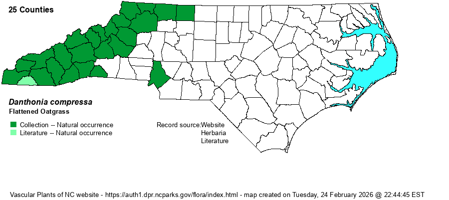 | Identification | As its name suggests, the stem is often compressed (at least sections of it), but this is not a very valuable key character. From the ubiquitous Poverty Oatgrass (D. spicata), it differs in the longer lemma teeth on each side of the awn (2.0-4.5 mm long vs. 0.8-1.8 mm long in D. spicata), and mature leaves are flexuous but not curled as in Poverty Oatgrass. | |