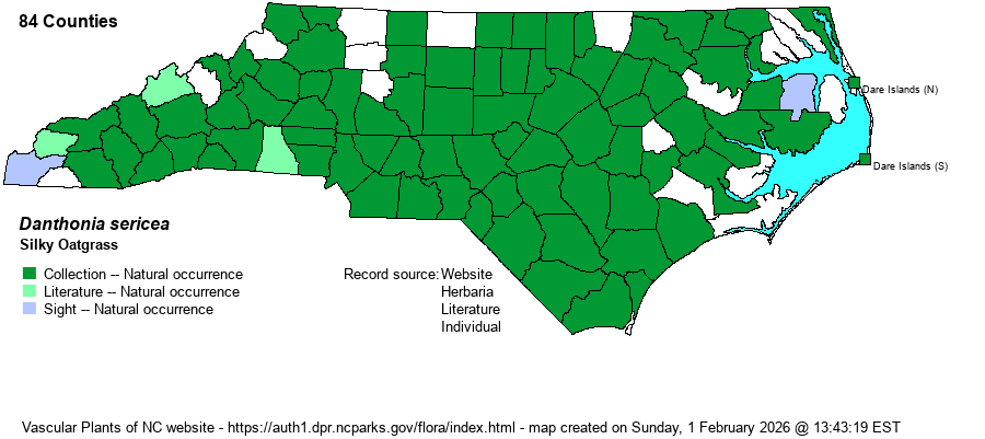 | Danthonia sericea | = | Danthonia sericea var. sericea | Gleason and Cronquist (1991) | | | Danthonia sericea | = | Danthonia sericea var. sericea | Gleason (1952) | | | Danthonia sericea | = | Danthonia sericea var. sericea | Radford, Ahles, and Bell (1968) | | | Danthonia sericea | < | Danthonia sericea | Flora of North America (1993b, 1997, 2000, 2002a, 2002b, 2003a, 2004b, 2005, 2006a, 2006b, 2006c, 2007a, 2009, 2010) | | | Danthonia sericea | < | Danthonia sericea | | | | Source: Weakley's Flora |