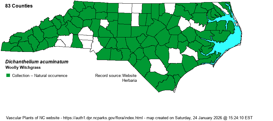 A note about Dichanthelium: This genus is not impossible to identify to species! But it takes applied effort over a period of time in order to learn the various species and what their morphological limits are. We strongly recommend that you read the introduction to the treatment in Weakley et al. (2025), written by Richard LeBlond. LeBlond has made order out of near chaos, and his keys work very well for our plants. Most Dichanthelium taxa ("Dichs") do not grow everywhere indiscrimminately, but prefer certain well-defined habitats. Note that most species produce flowers/fruits twice a year -- a vernal period and an autumnal period -- and that measurements of spikelets and achenes are taken from vernal plants. Some species also have a third, or summer, period. In the vernal period there is a single inflorescence at the tip of the stem. In the autumnal period, plants produce elongate branches with bunched (congested) leaves and so look very different from vernal plants--inflorescences are produced in leaf axils as well as at the tips of branches. NOTE: Older texts had these species essentially all within the very large genus Panicum. "Dich" species are typically named as "Witchgrass" and Panicum species named as "Panicgrass". | |