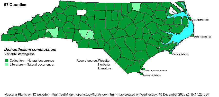 | Identification | Together, D. commutatum var. ashei and var. commutatum are among our most often encountered witchgrasses. Var. ashei has narrower and shorter leaves, plus very short-hairy (puberulent) stems (vs. glabrous). Leaves of var. commutatum may be broad enough to recall D. boscii and D. latifolium; see them for separation. | |