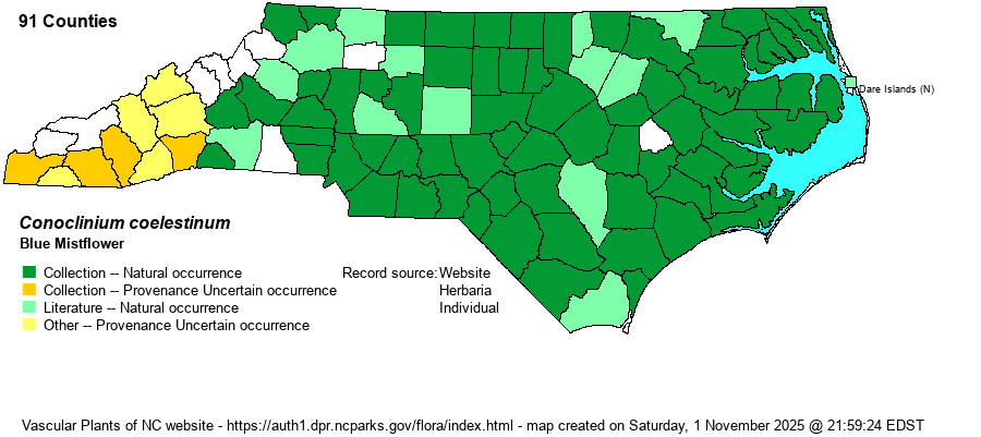 | Taxonomic Comments | In older texts treated as Eupatorium coelestinum.