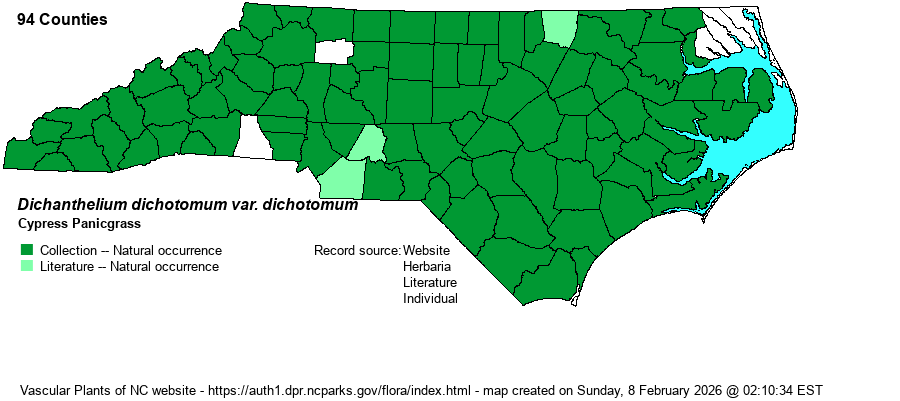 | Dichanthelium dichotomum var. dichotomum | < | Panicum dichotomum | Radford, Ahles, and Bell (1968) | |