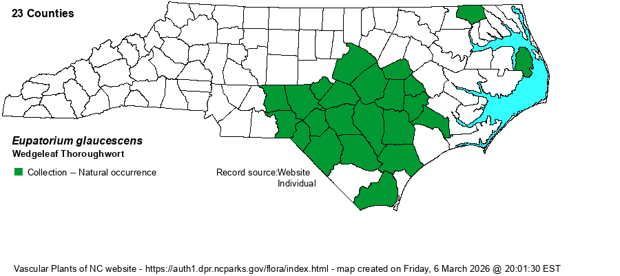 | Eupatorium glaucescens | < | Eupatorium cuneifolium | Gleason and Cronquist (1991) | | | Eupatorium glaucescens | < | Eupatorium cuneifolium | Gleason (1952) | | | Eupatorium glaucescens | < | Eupatorium cuneifolium | Radford, Ahles, and Bell (1968) | | | Eupatorium glaucescens | < | Eupatorium cuneifolium | Vascular Flora of the Southeastern States (Cronquist 1980, Isely 1990) | (also see E. linearifolium) | | Eupatorium glaucescens | ? | Eupatorium cuneifolium var. cuneifolium | Fernald (1950) | | | Eupatorium glaucescens | = | Eupatorium cuneifolium | Small (1933, 1938) | | | Eupatorium glaucescens | < | Eupatorium linearifolium | Flora of North America (1993b, 1997, 2000, 2002a, 2002b, 2003a, 2004b, 2005, 2006a, 2006b, 2006c, 2007a, 2009, 2010) | | | Eupatorium glaucescens | < | Eupatorium linearifolium | Wunderlin & Hansen Flora of Florida (3) | | | Source: Weakley's Flora |