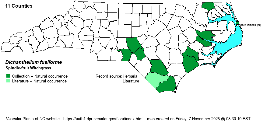 | Dichanthelium fusiforme | = | Panicum fusiforme | Fernald (1950) | | | Dichanthelium fusiforme | = | Panicum fusiforme | Gleason (1952) | | | Dichanthelium fusiforme | = | Panicum fusiforme | Hitchcock & Chase (Manual of US Grasses) | | | Dichanthelium fusiforme | = | Panicum fusiforme | Radford, Ahles, and Bell (1968) | | | Dichanthelium fusiforme | = | Panicum fusiforme | Small (1933, 1938) | | | Dichanthelium fusiforme | < | Panicum aciculare | Gleason and Cronquist (1991) | | | Dichanthelium fusiforme | = | Dichanthelium aciculare ssp. fusiforme | Flora of North America (1993b, 1997, 2000, 2002a, 2002b, 2003a, 2004b, 2005, 2006a, 2006b, 2006c, 2007a, 2009, 2010) | | | Dichanthelium fusiforme | < | Dichanthelium aciculare | Kartesz (1999) | | | Dichanthelium fusiforme | < | Dichanthelium aciculare | Thomas (2008). The treatment of Dichanthelium sect. Lanuginosa (=D. acuminatum group) is based cl | | | Source: Weakley's Flora |