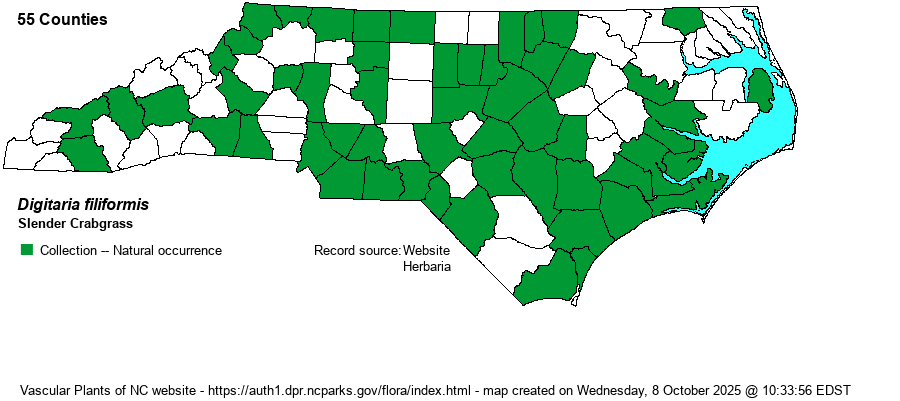 Identification | This species is much like the alien Hairy Crabgrass (D. sanguinalis), but it is noticeably slender in all respects. The branch (rachis) along which the spikelets grow is slender and not winged (vs. 0.5-1.0 mm wide, with wings as wide as the rachis itself in that species). Shaggy Crabgrass (D. villosa) differs mainly in it having larger spikelets (2.0-2.8 mm long vs. 1.7-2.2 mm long in D. filiformis); that species also has longer racemes (to 10 inches long vs. only to 4 inches long in D. filiformis). | |