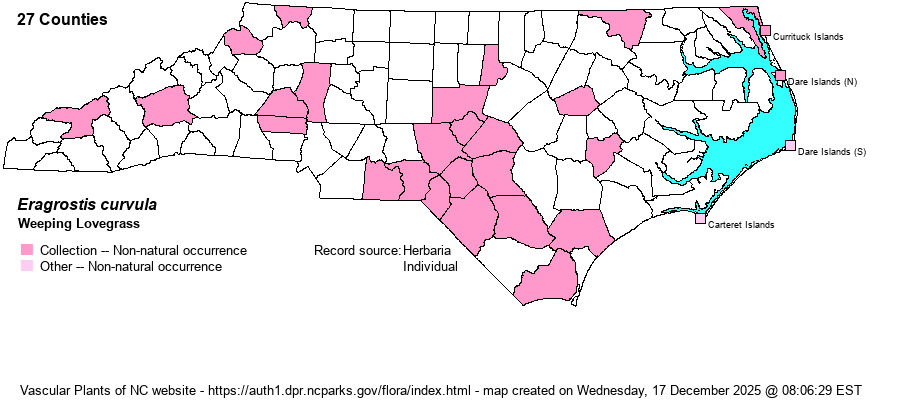 | Identification | Weeping Lovegrass grows as a tussock from a hard rhizome. The leaves are very numerous, very slender, and look a lot like Carolina Wiregrass (Aristida stricta). However, the leaves are relatively flat in the basal 1/2 to 2/3, and usually folded in the outer portion (vs. involute-rounded throughout). The inflorescence grows atop a slender, tall culm; it is dark gray in color and has spreading branches, thus is very unlike Wiregrass. | |