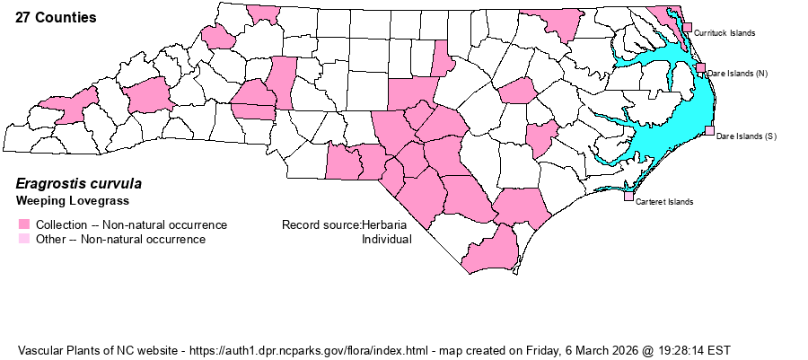 | Habitat | Xeric to dry roadsides, woodland openings, powerlines, maritime dry grasslands, disturbed areas. Planted as a soil stabilizer by state and federal agencies (Fort Bragg, Camp Mackall, game lands, NC DOT) and established locally. It tolerates fire well, but does not invade natural, fire-maintained Longleaf Pine-Wiregrass communities -- so far. | |