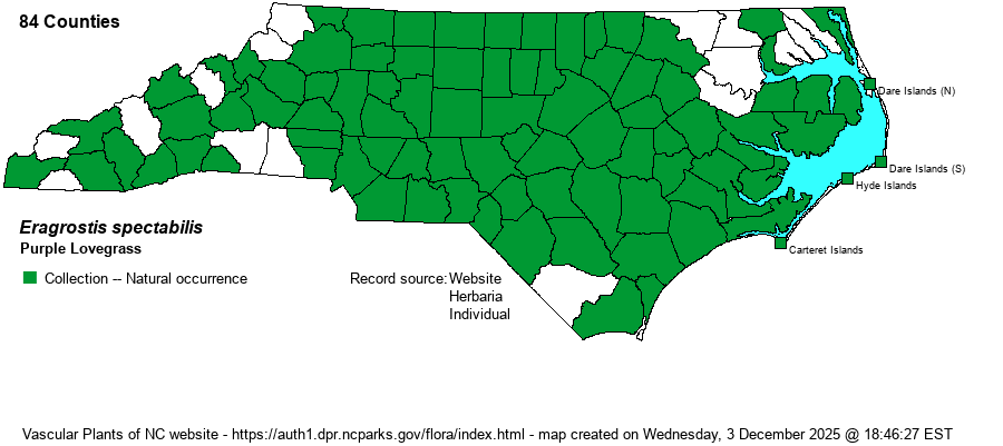 | Identification | The plants are relatively short and broad, with a very open, airy, hemispheric, red-purple to rosy pink inflorescence. Two other NC grasses have a similar look in the field -- Digitaria cognata has spikelets that are rounded or hemispheric in cross-section (vs. flattened), and Muhlenbergia capillaris also has flattened spikelets, but they are only one-flowered (vs. 6-12 flowers in E. spectabilis). | |