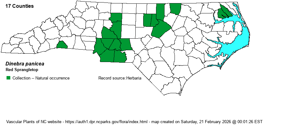 | Taxonomic Comments | In many texts treated as Leptochloa filiformis. Weakley (2025) considers the subspecies brachiata as occurring in NC.