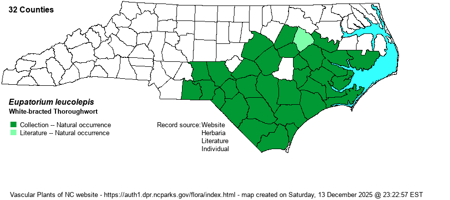 | Eupatorium leucolepis | = | Eupatorium leucolepis var. leucolepis | Gleason and Cronquist (1991) | | | Eupatorium leucolepis | = | Eupatorium leucolepis var. leucolepis | Fernald (1950) | | | Eupatorium leucolepis | = | Eupatorium leucolepis var. leucolepis | Gleason (1952) | | | Eupatorium leucolepis | < | Eupatorium leucolepis var. leucolepis | Flora of North America (1993b, 1997, 2000, 2002a, 2002b, 2003a, 2004b, 2005, 2006a, 2006b, 2006c, 2007a, 2009, 2010) | | | Eupatorium leucolepis | < | Eupatorium leucolepis var. leucolepis | Kartesz (1999) | | | Eupatorium leucolepis | < | Eupatorium leucolepis | Godfrey and Wooten (1979, 1981) | | | Eupatorium leucolepis | < | Eupatorium leucolepis | | | | Eupatorium leucolepis | < | Eupatorium leucolepis | Radford, Ahles, and Bell (1968) | | | Eupatorium leucolepis | < | Eupatorium leucolepis | Small (1933, 1938) | | | Eupatorium leucolepis | < | Eupatorium leucolepis | Vascular Flora of the Southeastern States (Cronquist 1980, Isely 1990) | | | Eupatorium leucolepis | < | Eupatorium leucolepis | Wofford (1989) | | | Eupatorium leucolepis | < | Eupatorium leucolepis | Wunderlin & Hansen Flora of Florida (3) | | | Source: Weakley's Flora |