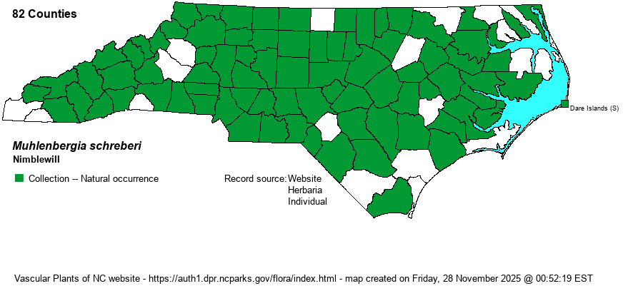 | Habitat | In a variety of situations, from moist bottomlands to dry uplands, old woods roads, trailsides, logging roads, clearings. This is our weediest native muhly. | |