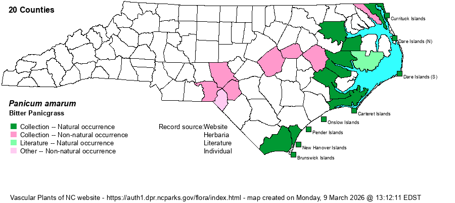 | Habitat | Maritime dry grasslands, dunes, storm overwash fans, roadsides. Inland records are from railroad margins and roadsides. Planted extensively at the Sandhills Game Land (Richmond and Scotland counties) to provide cover and food in areas lacking Carolina Wiregrass (Aristida stricta), and spreading along roadsides and clearings. |