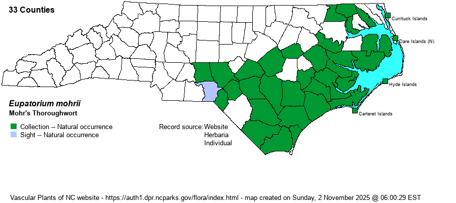 | Eupatorium mohrii | < | Eupatorium mohrii | Gleason and Cronquist (1991) | | | Eupatorium mohrii | < | Eupatorium mohrii | Flora of North America (1993b, 1997, 2000, 2002a, 2002b, 2003a, 2004b, 2005, 2006a, 2006b, 2006c, 2007a, 2009, 2010) | | | Eupatorium mohrii | < | Eupatorium mohrii | Kartesz (1999) | | | Eupatorium mohrii | < | Eupatorium mohrii | Vascular Flora of the Southeastern States (Cronquist 1980, Isely 1990) | | | Eupatorium mohrii | < | Eupatorium mohrii | Wofford (1989) | | | Eupatorium mohrii | < | Eupatorium mohrii | | | | Eupatorium mohrii | < | Eupatorium recurvans | Fernald (1950) | | | Eupatorium mohrii | < | Eupatorium recurvans | Gleason (1952) | | | Eupatorium mohrii | < | Eupatorium recurvans | Radford, Ahles, and Bell (1968) | (also see E. anomalum and E. recurvans) | | Eupatorium mohrii | < | Eupatorium anomalum | Small (1933, 1938) | (also see E. anomalum) | | Source: Weakley's Flora |