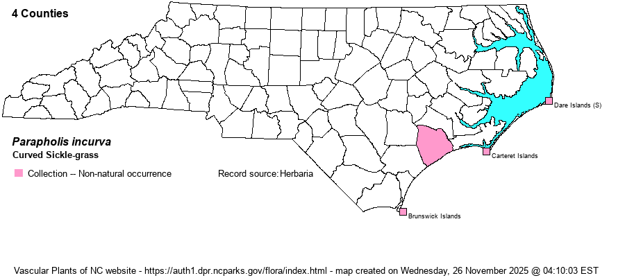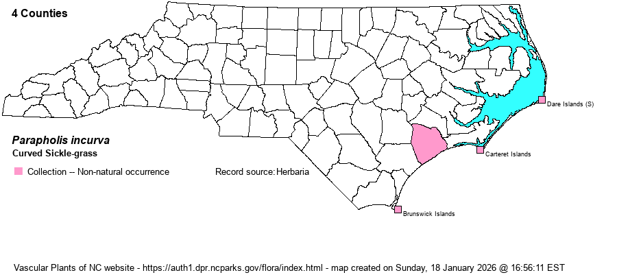 | Account for Curved Sickle-grass - Parapholis incurva (L.) C.E. Hubbard | Only member of Parapholis in NC. | |||||||||