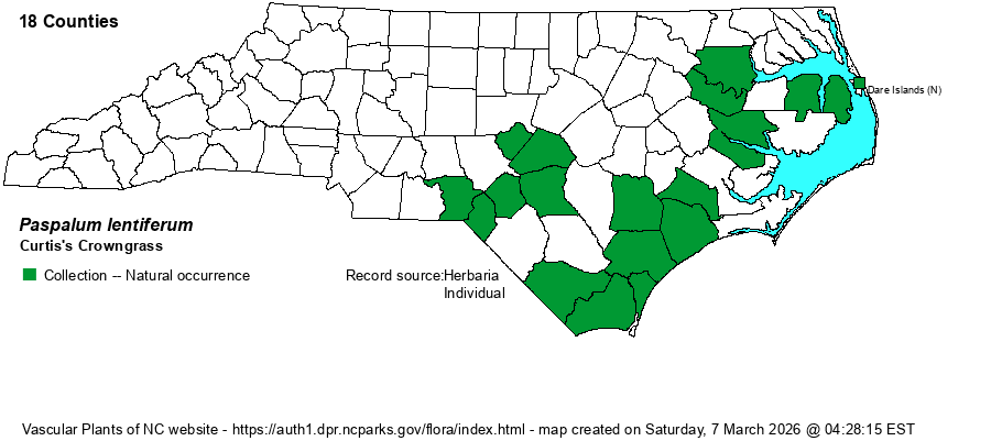 | Taxonomic Comments | Included here are plants originally determined as Paspalum lentiferum. Some authors, such as FNA, Blomquist (1948), and Weakley et al. (2012, Flora of Virginia) lump this variety (P. praecox var. curtisianum), due to very similar habitats and range. However, in 2023, Weakley moved the former variety back to a full species, as P. lentiferum, although admitting that differences between the two are not strong. It may be best to treat them as varieties of P. praecox.