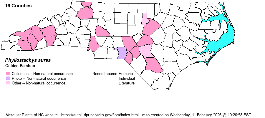 | Distribution | Mostly Sandhills, Piedmont, and Mountains; apparently rare on the Coastal Plain. Our specimens need to be double-checked for P. bambusoides.