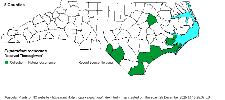 | Distribution | Mostly the southern Coastal Plain; not known from the Sandhills proper. As mentioned below, the species was moved in recent decades to E. mohrii. However, Weakley (2024) and a few other references have pulled out this "renamed" recurvans from the much more common Mohr's Thoroughwort (E. mohrii). Thus, the many dozens of specimens in SERNEC listed as E. recurvans are probably mostly now E. mohrii, and all NC specimens of Recurved Thoroughwort need to be checked for identification, including the ones mapped below.