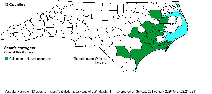 | Distribution | Outer and middle Coastal Plain. Absent from the Outer Banks and barrier islands, as well as in the northeastern counties (as it does not range into VA). The most recent collections at SERNEC are 1981 (Beaufort County) and 1979 (Craven County).