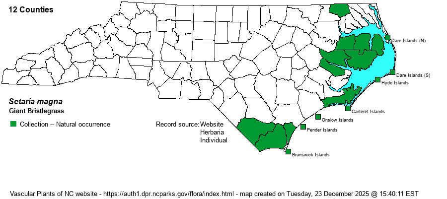 | Identification | As the name Giant Bristlegrass implies, this is our tallest and most robust bristlegrass, reportedly up to 18 feet tall (FNA), but in NC usually 5-10 feet -- still one of the taller herbaceous species in the state. The bristles are very long (10-20 mm) and give the inflorescence a foxtail look. This is an annual: from seedling to fruit all in a single growing season. This is a quite conspicuous species of our coastal marshes owing to its great height and long and often gracefully curved inflorescence. | |