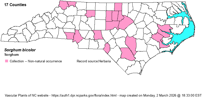 | Identification | Sorghum is a popular agricultural crop in NC. The plants grow less than 4 feet tall (reportedly 4 times that in FNA), with broad leaves and a thick, ellipsoid inflorescence. From a distance the yellowish or straw-colored spikelets can easily be seen. | |