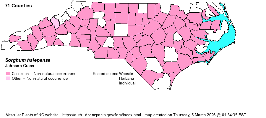 | Identification | Johnson Grass is a very familiar roadside weed, growing up to 6 or 7 feet tall from tough horizontal rhizomes. The leaves may reach 3 feet long and taper gradually to the tip. The inflorescence is roughly triangular in outline, rather open, the main branches well-spaced. Note the prominent awn on each spikelet and the reddish color of the inflorescence. | |