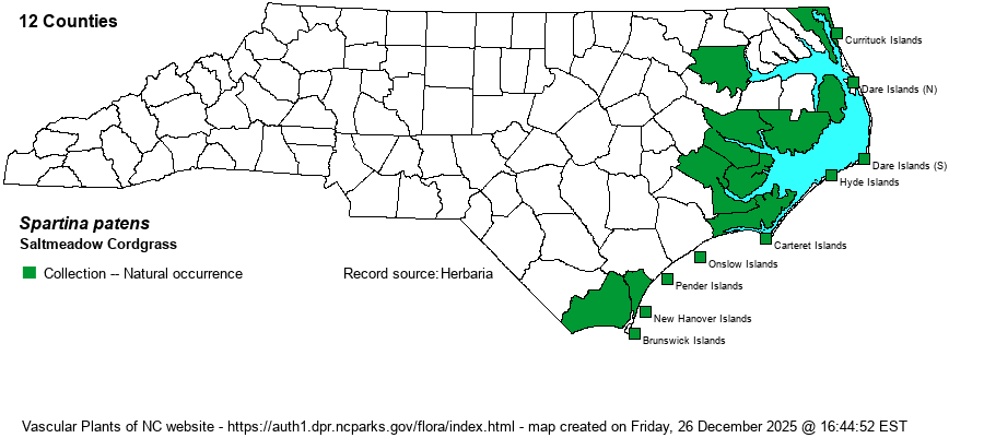| Taxonomic Comments | Most of our plants are the entity named Spartina patens var. monogyna, based on a rapid search through specimens at NCU in 2022. Specimens of the more northern var. patens were noted from Bertie, Craven, Currituck, and Dare counties.