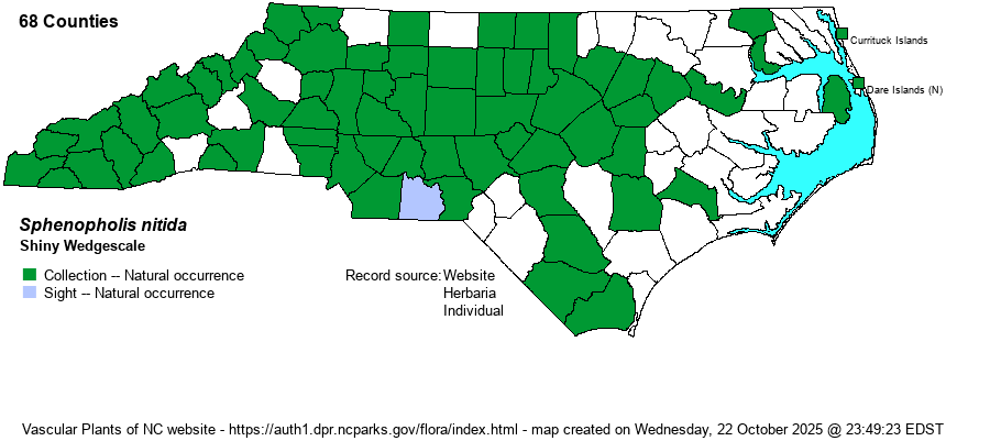 | Distribution | Mountains and Piedmont; scattered on the Coastal Plain in nutrient-rich sites near brownwater rivers, but scarce on the Outer Banks. Absent from the Sandhills proper.