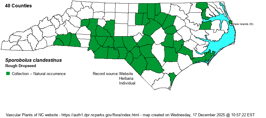 | Distribution | Piedmont, Sandhills, and Coastal Plain; scarce on the Outer Banks.