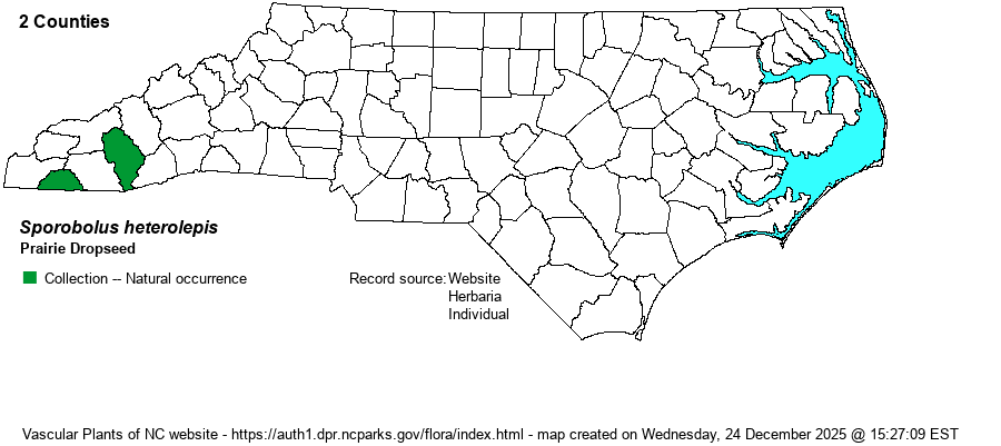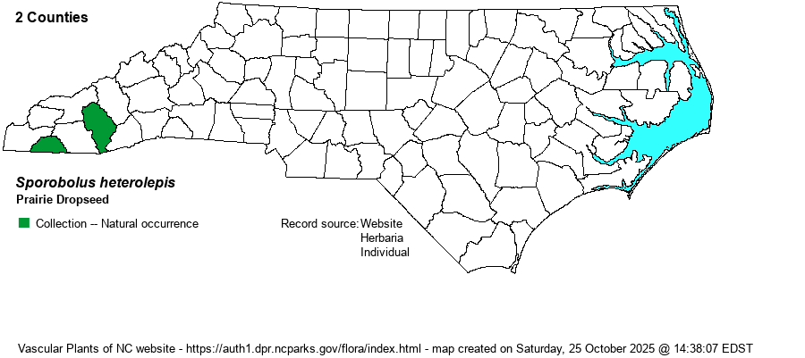 | Identification | Prairie Dropseed is a clump-forming perennial bunchgrass, with many arching leaves up to a foot long. Flowering stems stand rather erect, 1-2.5 feet tall, with an open, airy inflorescence. It may resemble Muhlenbergia capillaris, but that species has a distinctly pink or red-purplish inflorescence (vs. straw-color or light brownish in S. heterolepis). | |