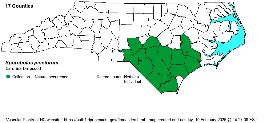 | Taxonomic Comments | Carolina Dropseed was overlooked or misidentified as other dropseeds (mostly S. teretifolius) until the 1990s.