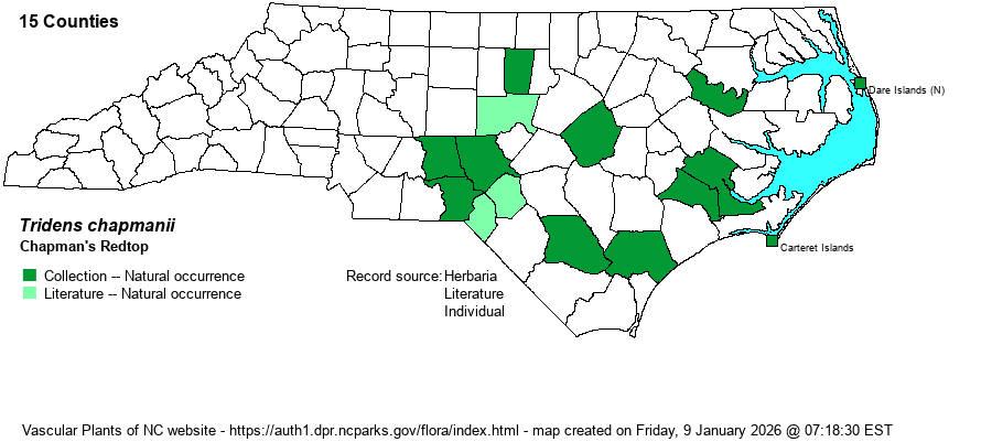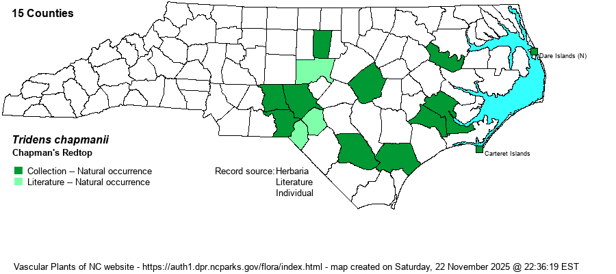 | Tridens chapmanii | = | Tridens flavus var. chapmanii | Gleason and Cronquist (1991) | | | Tridens chapmanii | = | Tridens flavus var. chapmanii | Flora of North America (1993b, 1997, 2000, 2002a, 2002b, 2003a, 2004b, 2005, 2006a, 2006b, 2006c, 2007a, 2009, 2010) | | | Tridens chapmanii | = | Tridens flavus var. chapmanii | Kartesz (1999) | | | Tridens chapmanii | = | Tridens flavus var. chapmanii | Radford, Ahles, and Bell (1968) | | | Tridens chapmanii | = | Tridens flavus var. chapmanii | Wunderlin & Hansen Flora of Florida (3) | | | Tridens chapmanii | = | Triodia chapmanii | Fernald (1950) | | | Tridens chapmanii | = | Triodia chapmanii | Gleason (1952) | | | Tridens chapmanii | < | Triodia flava | Small (1933, 1938) | | | Source: Weakley's Flora |
