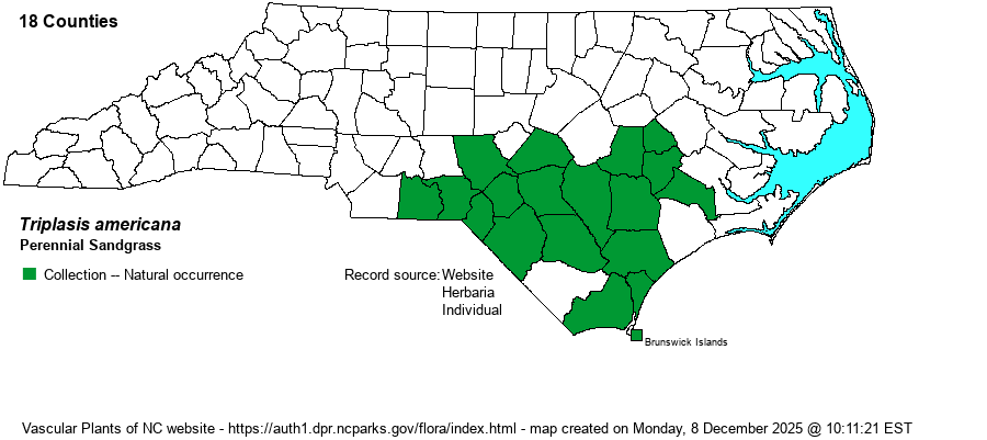 | Distribution | Sandhills and southern Coastal Plain; scarce on barrier islands. Ranges north only to Greene, Harnett, and Moore counties.