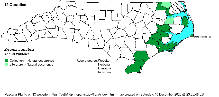 | Identification | Annual Wild-rice is very distinct. Plants usually emerge from shallow water, the stems typically reaching 6-9 feet tall -- our tallest annual grass. Leaves are 2-3 feet long and up to 2 inches wide. The inflorescence is fairly open and 1-2 feet long, the lower branches arching while the upper branches are strongly ascending. It is a good food for waterfowl, and it is the only known foodplant for caterpillars of the Rare Skipper (Problema bulenta) in NC. | |