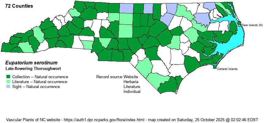 | Distribution | More-or-less throughout the state, but with gaps in the Mountains, upper Piedmont, Sandhills, and middle Coastal Plain. Weakley (2018) suggests that this species' original range was near-coastal and maritime, but has moved inland with disturbance. However, the wide distribution across the eastern U.S. argues against this, as does the paucity of specimens from the Outer Banks and the odd gap (real?) in the central Coastal Plain.