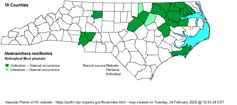 | Distribution | With the separation of H. multiflora (in 2020 now all moved to H. pauciflora) from H. reniformis, all specimens of the latter must be identified anew. Recent review of specimens in SERNEC show its range as being limited mainly to the northern Coastal Plain, south to Carteret County, and westward sparingly in the Piedmont to Forsyth and Mecklenburg counties.