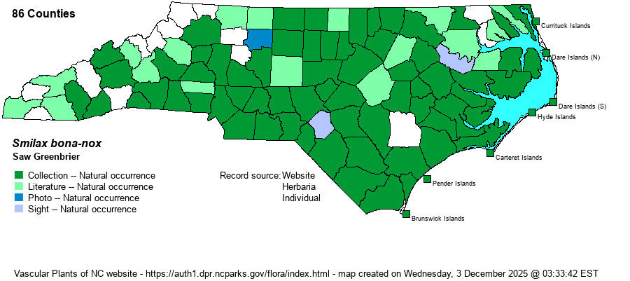 | Habitat | This vine has a very wide range of habitats, especially in thickets, wooded borders, openings in forests, and other semi-disturbed places. It can be found in forest interiors, both in floodplains and uplands. In maritime counties it inhabits stable dunes and maritime forests (var. littoralis). Thus, it has no distinctive or dominant habitats in the state. |