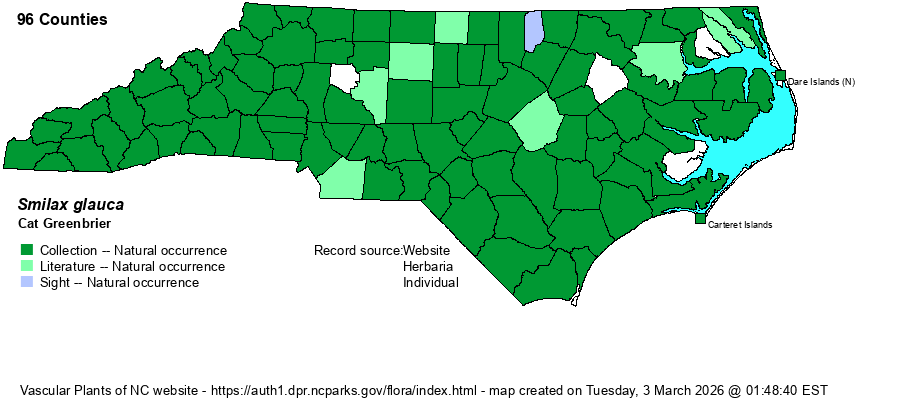 | Identification | This is a semi-evergreen or tardily deciduous woody vine, more slender stemmed than many other greenbriers and less inclined to climb high into trees. It often forms tangles over shrubs and saplings. Though its leaf size and shape resembles that of Common Greenbrier (S. rotundifolia), being widely ovate to nearly rounded, and about 3-4 inches long, all one needs for identification is the very glaucous/whitened underside of the leaves. It has many slender prickles along the stems but is not so heavily armed and difficult to walk through as species such as Laurel Greenbrier (S. laurifolia) and Common Greenbrier, owing to thinner and more flexible stems. The fruit are glaucous blue berries. Though observers should quickly see this species in most forests, many plants are young and consist of short stems lying on the ground. As such, it can be easily overlooked, as so much of its presence is as short ground-dwelling vines that have yet to start climbing over shrubs and saplings. | |