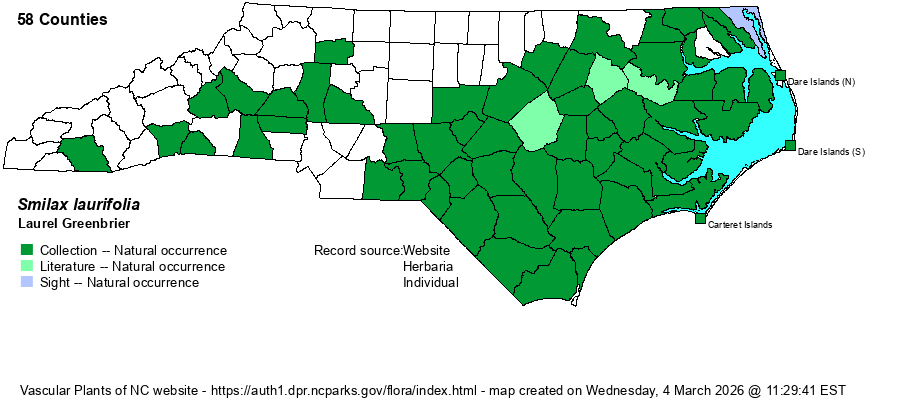 | Identification | This is a very strong and robust, high-climbing evergreen vine, as anyone who has explored in the Sandhills and in pocosins knows first-hand. The leaves are very thick and leathery, being elliptical or more frequently oblong (leaf sides are often parallel), somewhat rounded at the tip, and about 3-4 inches long. Leaves are commonly 1.5-2 inches wide, but may range up to 3 inches. Though the stems do have some strong thorns, the sturdy vines can grow so thickly over other vegetation that it is the stems themselves, and not the thorns, that deter most human passage through pocosins and streamheads. Because the berries take so long to mature, one often sees pale green, immature berries on the vines in fall and winter. Of the native plant species, this along with Poison-ivy (Toxicodendron radicans) and a few blackberries (Rubus spp.) are the most disliked in terms of deterrents to field work! | |