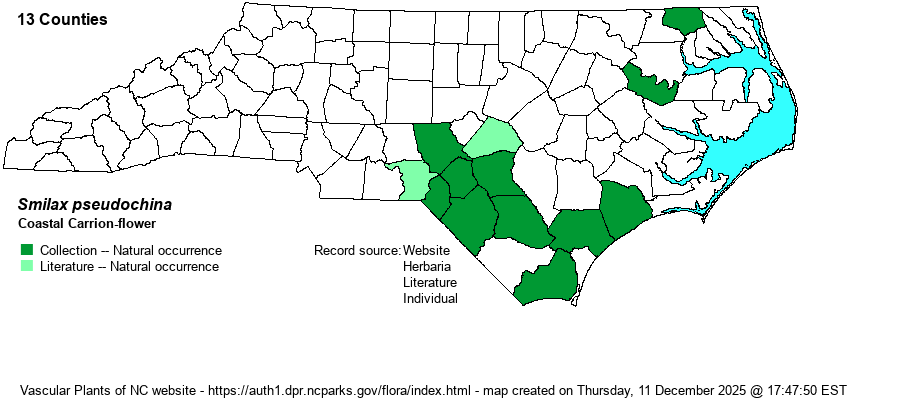 | Taxonomic Comments | This species was known as Smilax tamnifolia for much or most of the 20th Century. Some references may spell the name as pseudo-china, instead of pseudochina.