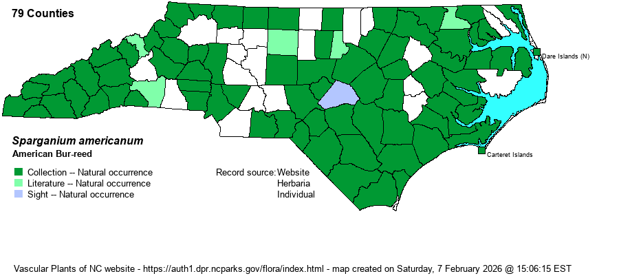 | Identification | This is a familiar semi-aquatic species -- growing in water but most of the plant is above the surface -- across the state. It has a quite stout stem, reaching 2 feet tall on average, rarely to 3 feet high. It has a few alternate leaves that are ascending, up to 2-3 feet long but only 1/2-inch wide, essentially strap-shaped, with a rounded tip. The inflorescences are from the leaf axils, simple or branched, from 1-6 heads or "balls" of flowers in a globose shape, white in color, each about 1 inch across, on a zigzag stalk. When these balls of flowers/fruit are visible, this is a very easy species to identify. However, some plants may be sterile or at least not flowering, and you will have to try to identify them by the long and narrow strap-like leaves. At times all of these leaves are submerged, but the rounded tips should be helpful in the identification. For separation from the rare-in-NC S. acaule, see that species account. | |