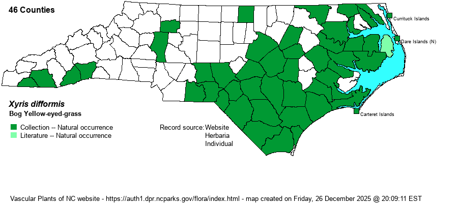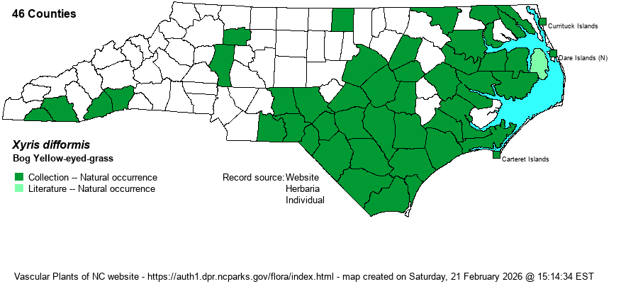 | Xyris difformis | = | Xyris difformis var. difformis | Gleason and Cronquist (1991) | | | Xyris difformis | = | Xyris difformis var. difformis | Flora of North America (1993b, 1997, 2000, 2002a, 2002b, 2003a, 2004b, 2005, 2006a, 2006b, 2006c, 2007a, 2009, 2010) | | | Xyris difformis | = | Xyris difformis var. difformis | Godfrey and Wooten (1979, 1981) | | | Xyris difformis | = | Xyris difformis var. difformis | Kartesz (1999) | | | Xyris difformis | = | Xyris difformis var. difformis | Kral in Kubitzki (1998b). Key adapted from X, GW, and Z. | | | Xyris difformis | < | Xyris difformis | Fernald (1950) | | | Xyris difformis | < | Xyris difformis | Gleason (1952) | | | Xyris difformis | < | Xyris difformis | | | | Xyris difformis | < | Xyris difformis | Radford, Ahles, and Bell (1968) | | | Xyris difformis | < | Xyris difformis | Small (1933, 1938) | | | Xyris difformis | < | Xyris difformis | Wofford (1989) | (also see X. curtissii) | | Source: Weakley's Flora |