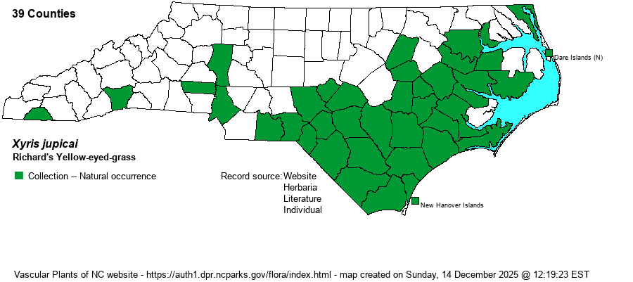 | Identification | Richard's Yellow-eyed-grass must be identified with care, as it has no outstanding characters of its own. It is a medium-sized species, with scapes 1-2 feet tall and leaves nearly that long and 5-10 mm wide. Lateral sepal keels are irregularly cut and shorter than the scales. Leaves lack pink or maroon tones basally. | |